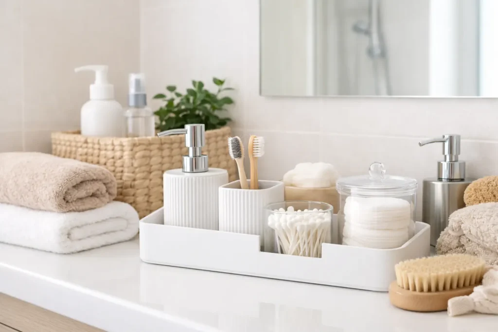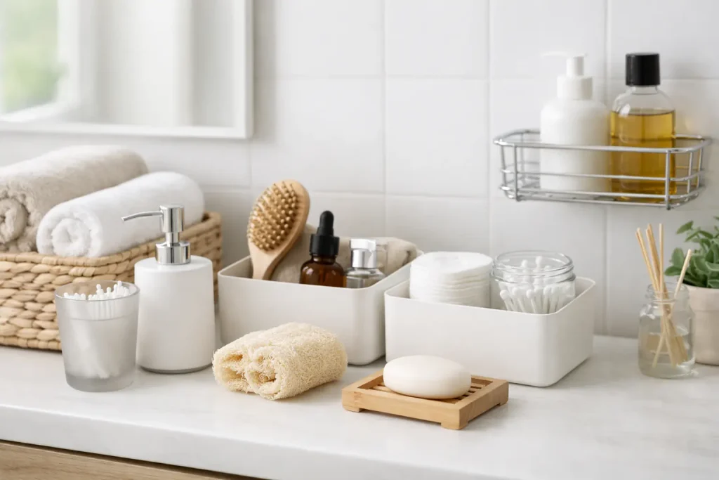 Pierwszy kierunek to stałe miejsce na rzeczy używane codziennie. Nie musi to być nic wielkiego — czasem wystarcza prosty pojemnik na drobiazgi przy umywalce, organizer na kosmetyki albo mała tacka, która trzyma w ryzach kilka rzeczy naraz (np. krem, szczoteczkę, maszynkę, gumki do włosów). Dzięki temu nie zaczyna się dnia od przekładania rzeczy z jednego kąta w drugi.